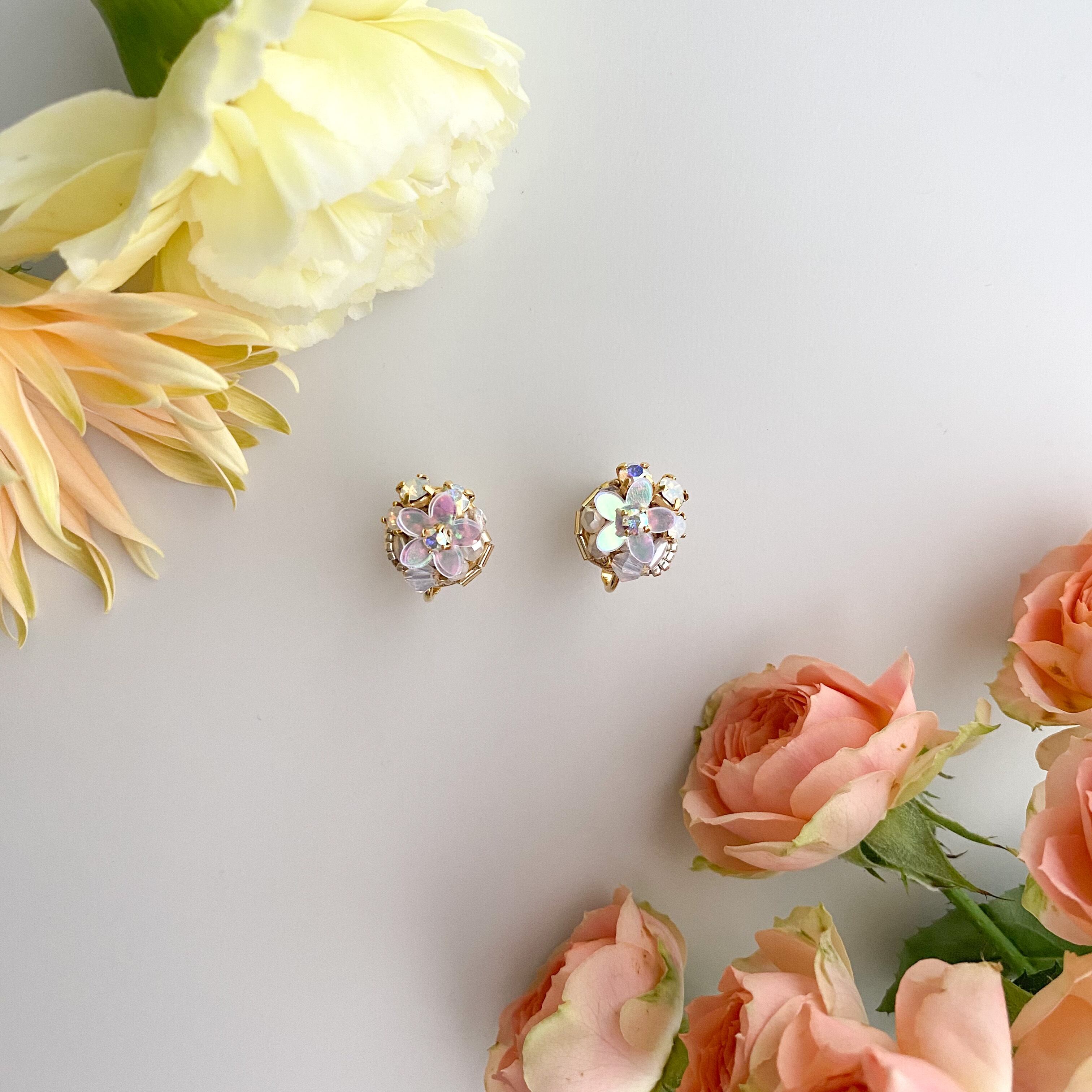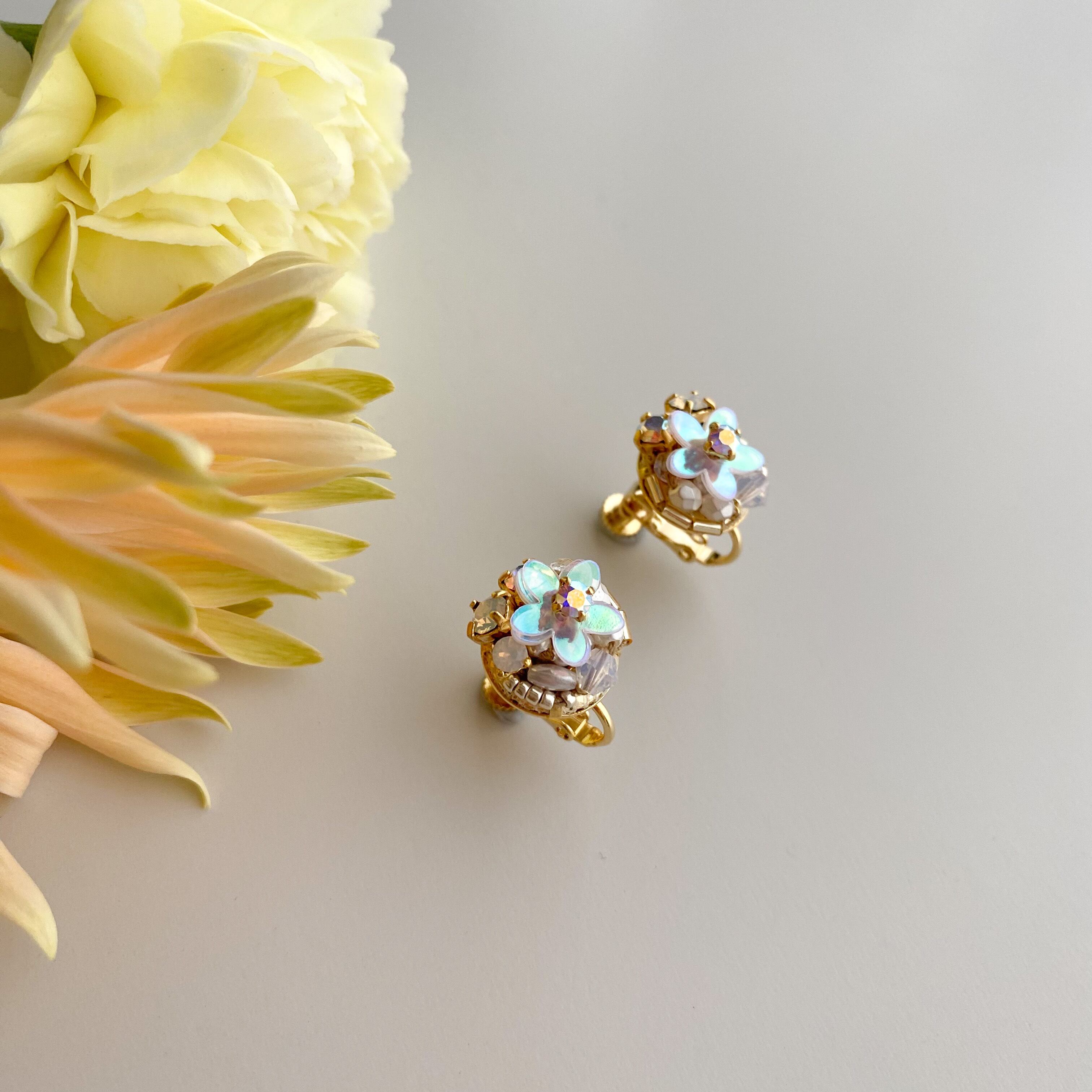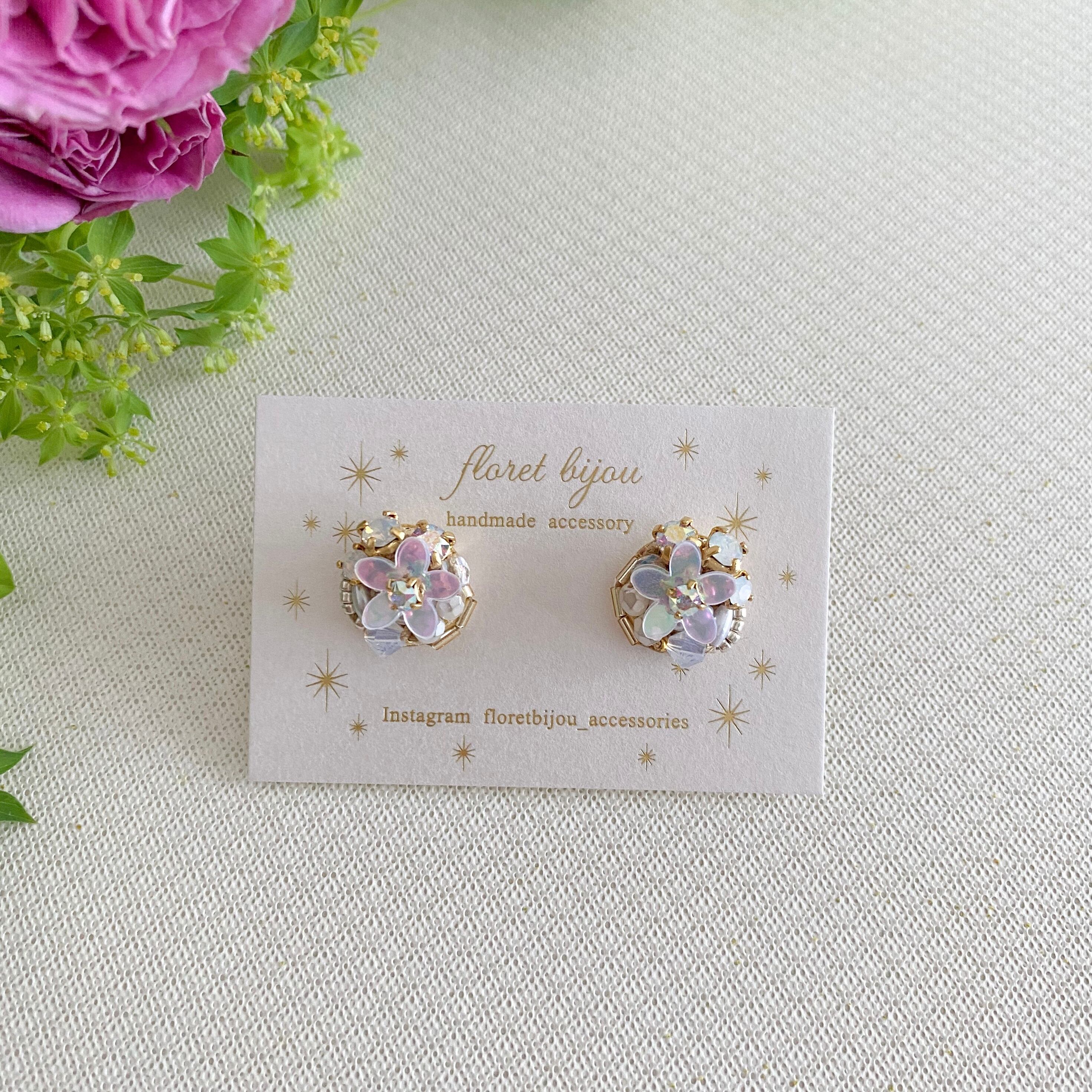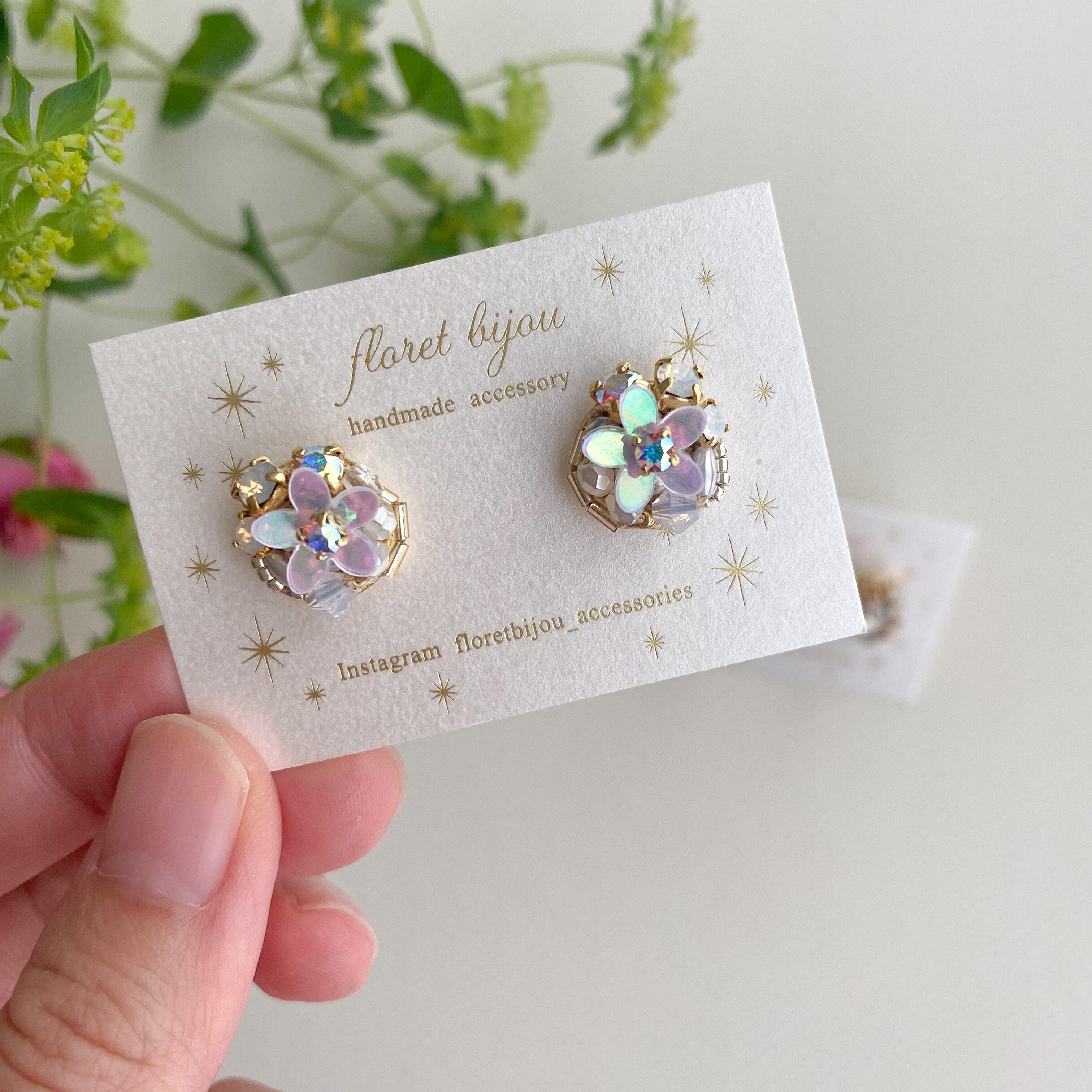 ✴︎こちらのデザインはパーツを糸で縫って制作しています。お花型のスパンコールは中央部分を縫い留めているため、触るとパーツがくるっと回ることがあります。予めご了承ください。