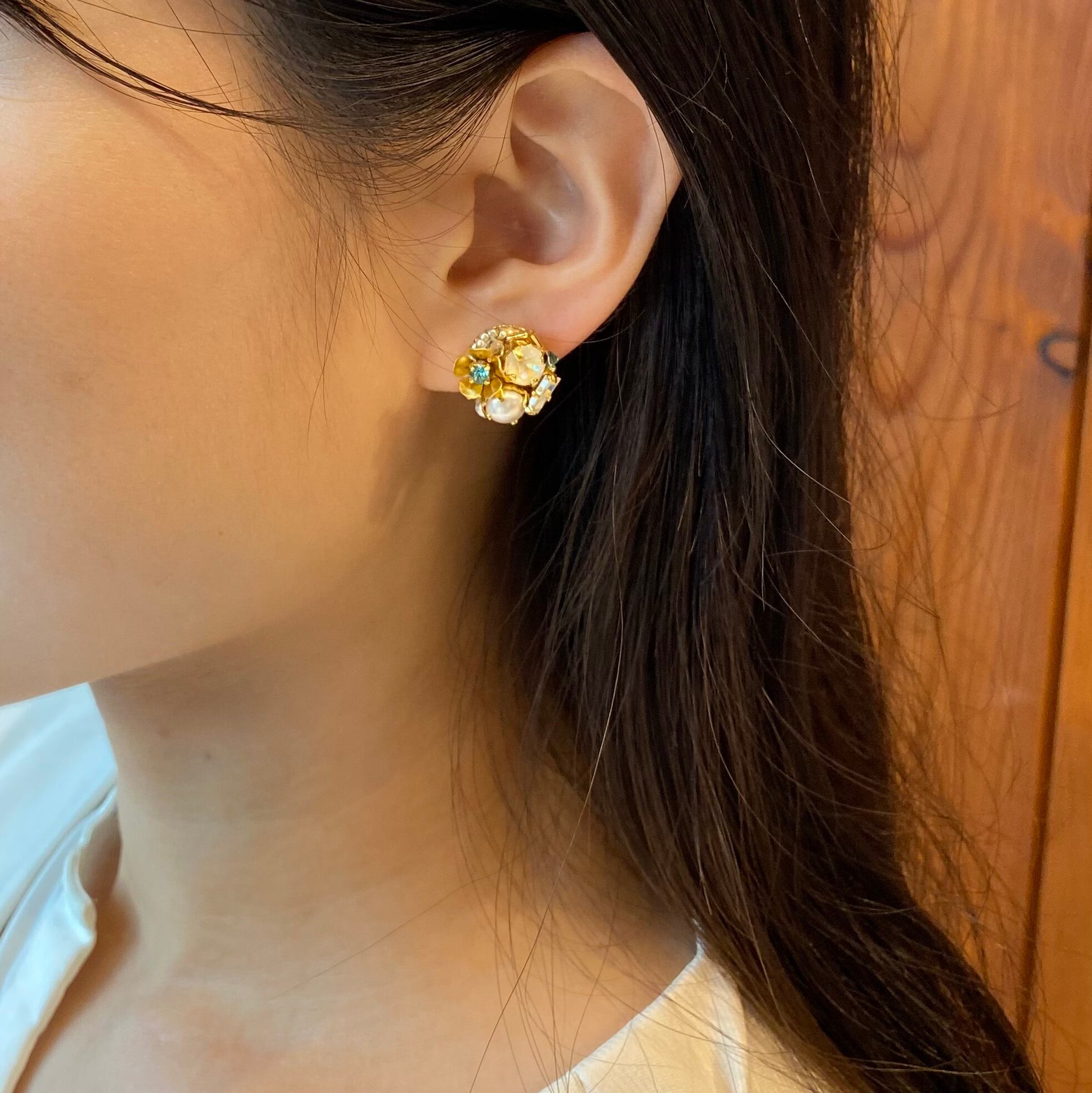 マットゴールドのお花型のメタルパーツにブルーグリーンのビジューがアクセントの大人可愛い印象のデザインの耳飾りです。