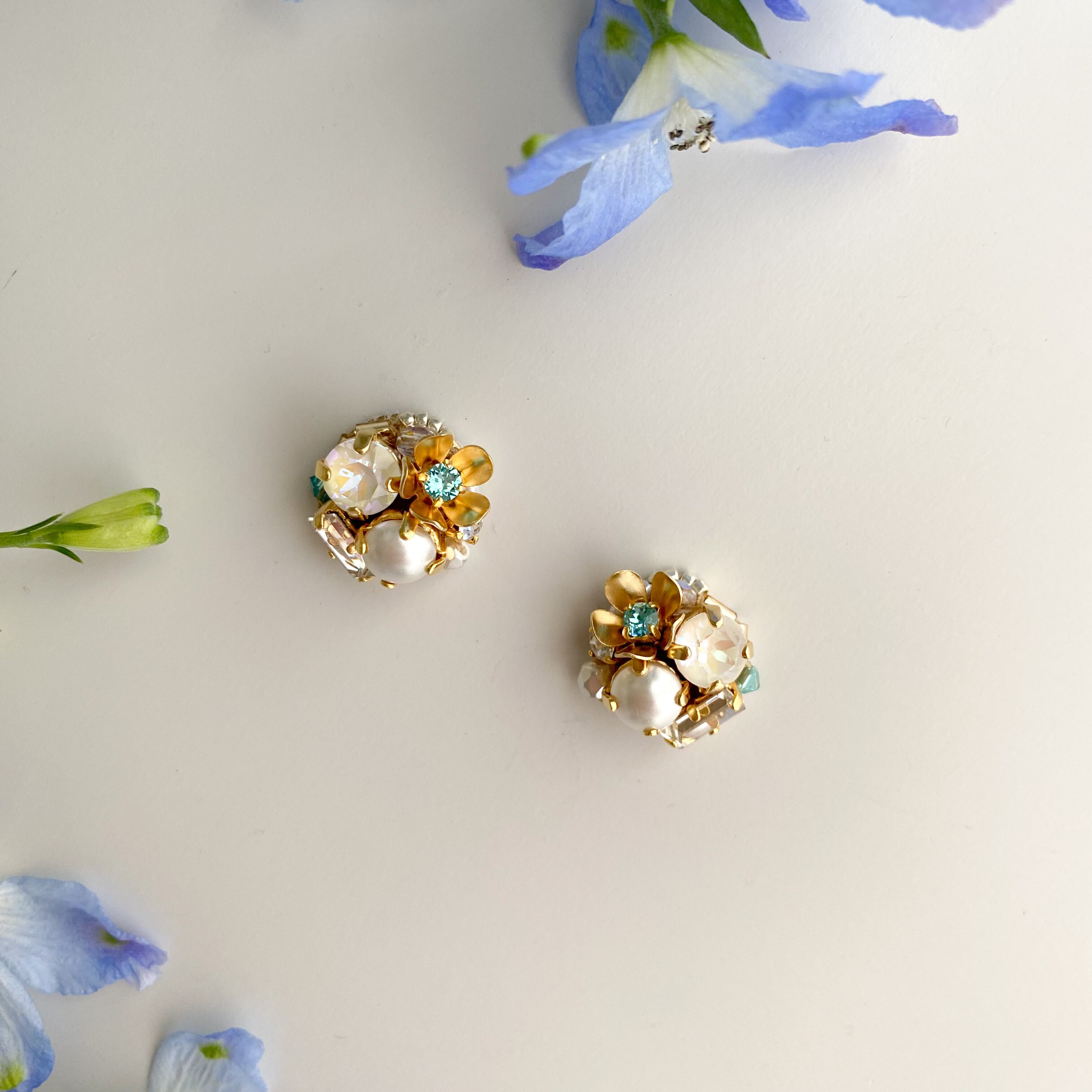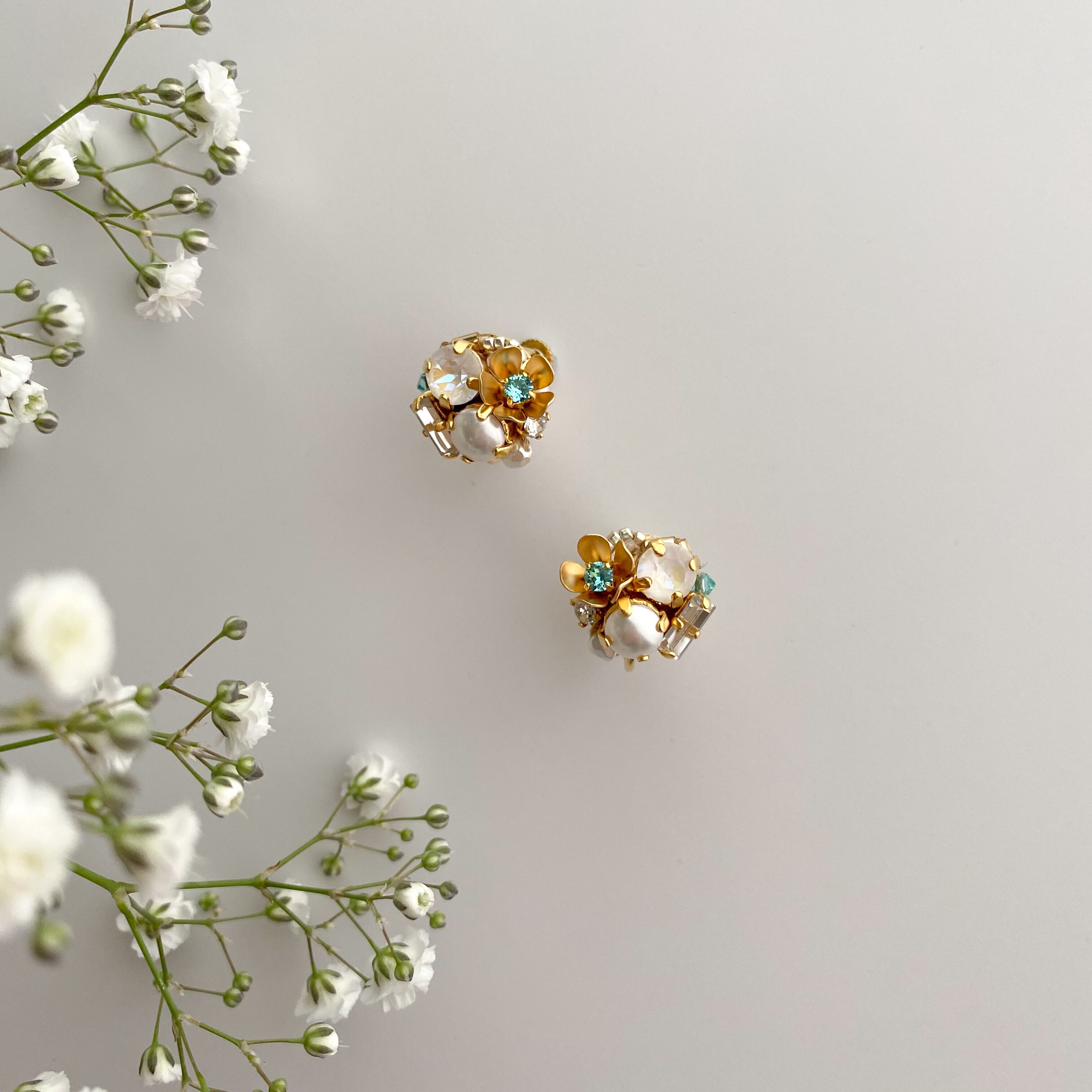 ゴールドのお花のメタルパーツに鮮やかなブルーグリーンのビジューを合わせて爽やかな印象に仕上げました。